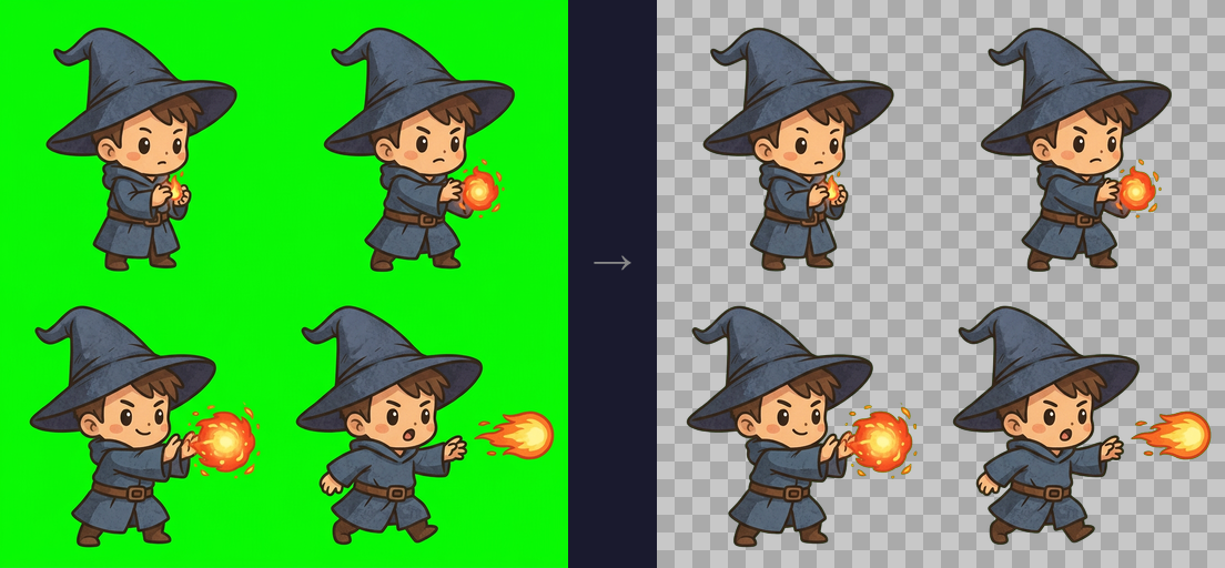Go from a text prompt to a playable sprite animation in seconds. Gemini image generation, a green-screen pipeline, and reference images for character consistency.